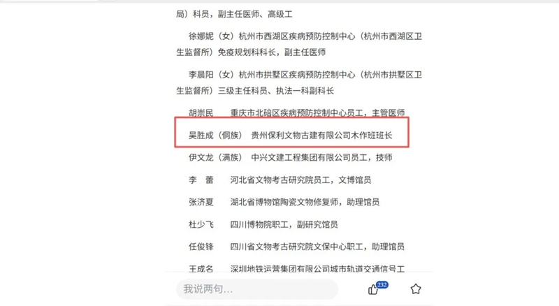 近日,2026年全国五一劳动奖拟表彰对象公示,贵州保利文物古建有限公司木作班班长吴胜成成功入选全国五一劳动奖章拟表彰人选。